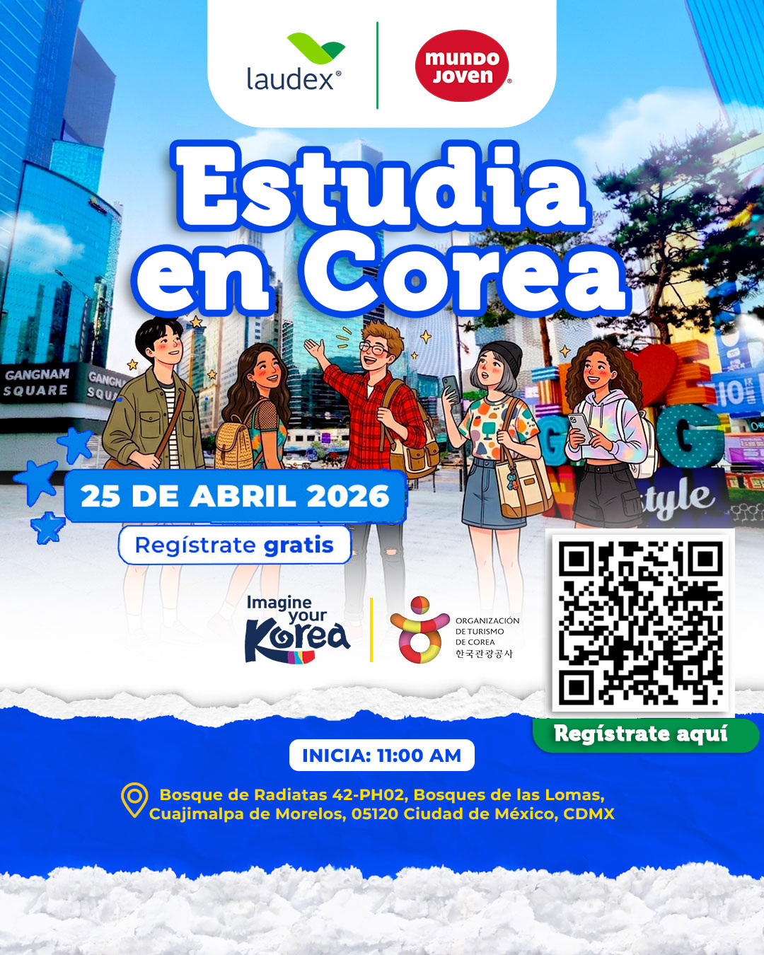 En este evento podrás conocer opciones de financiamiento y programas académicos en Corea en colaboración con Mundo Joven + Laudex y entender cómo transformar tu meta de estudiar en el extranjero en un plan real.